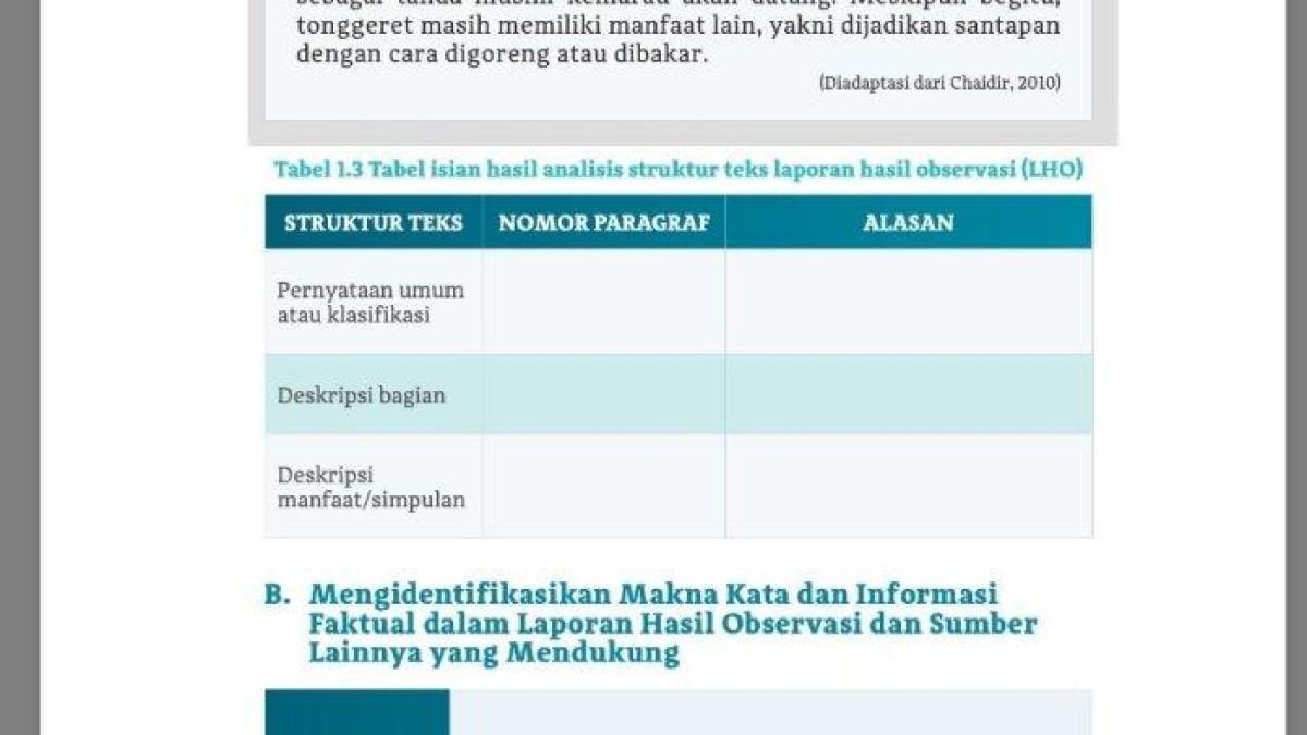Pada halaman 9, siswa diminta untuk mengisi Tabel 1.3 yang membahas analisis struktur teks Laporan Hasil Observasi (LHO). Salah satu fokus utama soal adalah mengidentifikasi alasan di balik struktur dan isi teks laporan yang diamati.