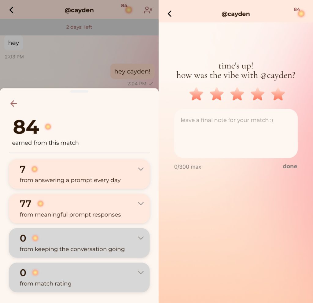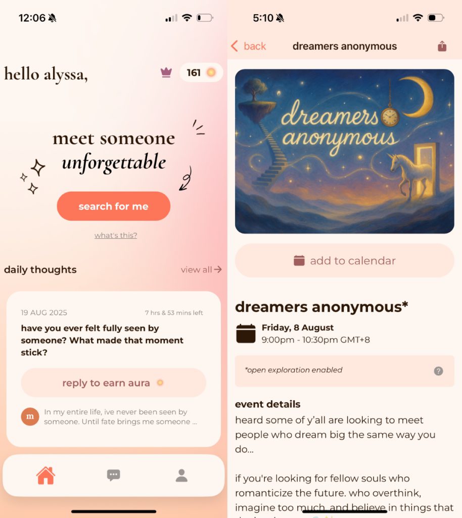 Initially, matches stay anonymous, reducing social pressure and promoting truthfulness. During conversations, the app also offers random prompts for both users to answer, allowing them to gain extra Aura points.