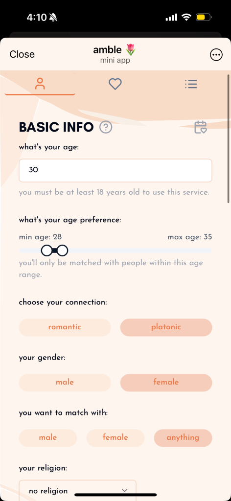 Starting with Amble is straightforward. Users start by filling out a profile and choosing the kinds of connections they are willing to have.