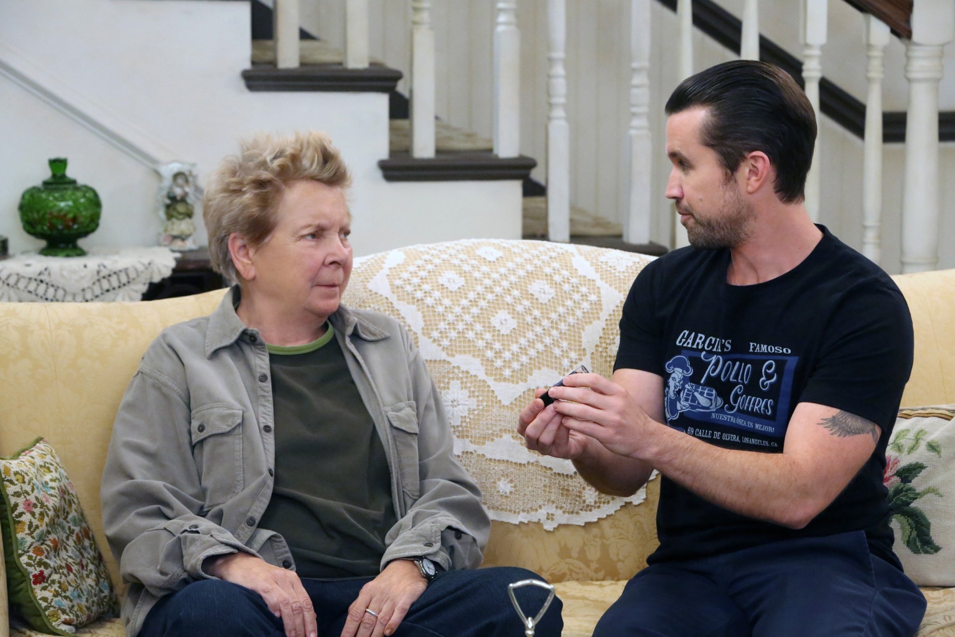 We were exploring various methods without needing a harness connected to numerous wires and cables that we would have to remove. I was at Mike Hermosa's (director) house, and I was coming up with ideas for the scene. I glanced at his couch and noticed there was just enough room underneath it to fit my feet.