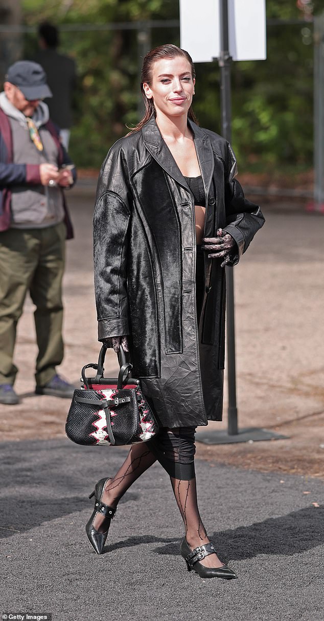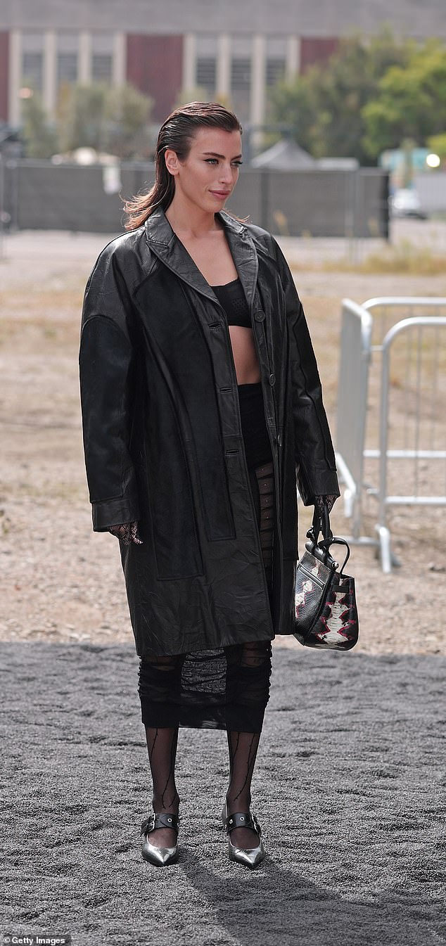 The 29-year-old model appeared stunning as she showcased her abdominal muscles in a small black bra and a leather outfit that matched.trench coat.
