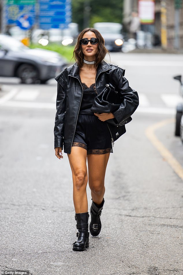 Tamara Kalinic emerged in black satin shorts, complemented by a matching vest and thick black boots.