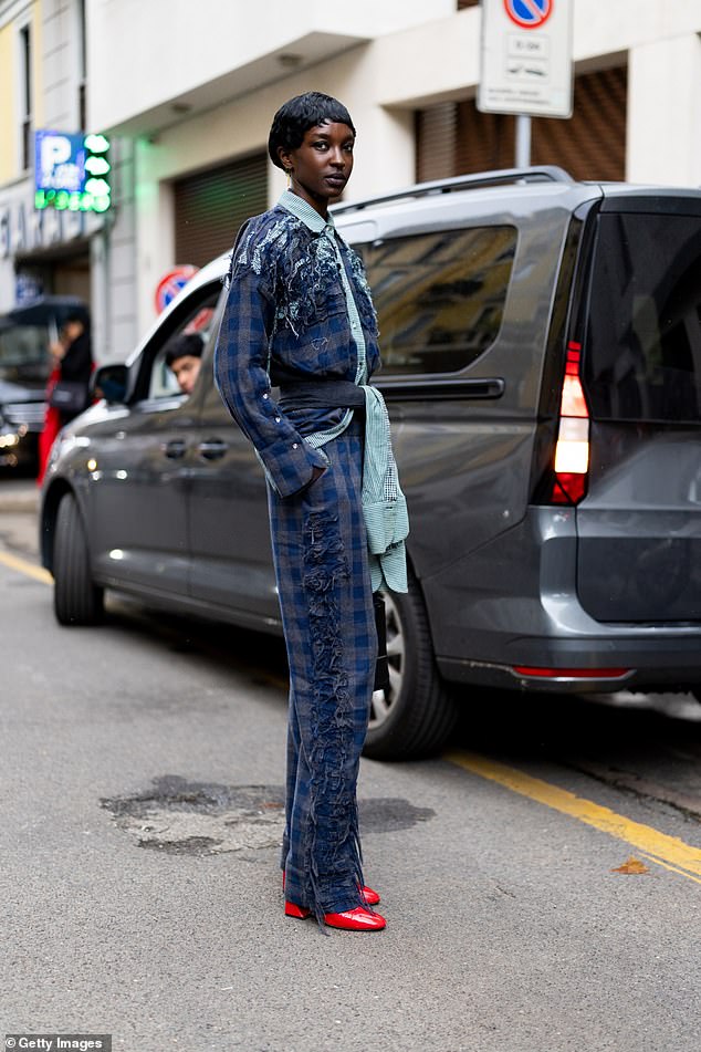 Nicole Atieno made a striking appearance in a blue and grey plaid two-piece set, complemented by a blue top and red leather footwear.