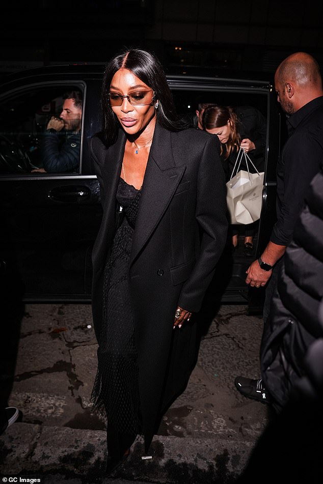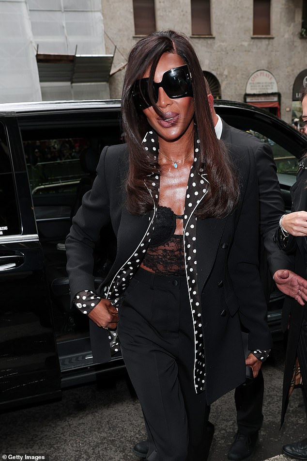 Top model Naomi, 55, appeared stylish in a lace black top worn underneath a black and white jacket.