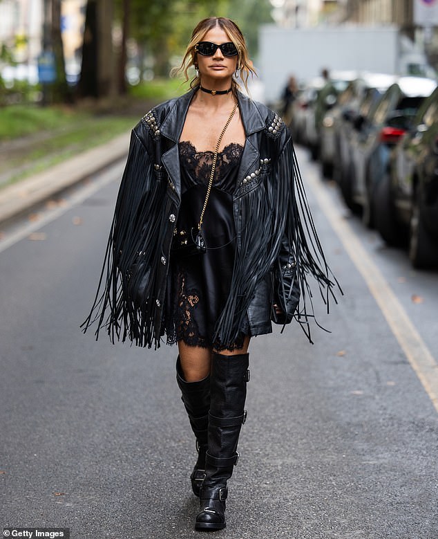 Thassia Naves appeared stunning in a black dress paired with an eye-catching leather jacket that had tasseled sleeves.