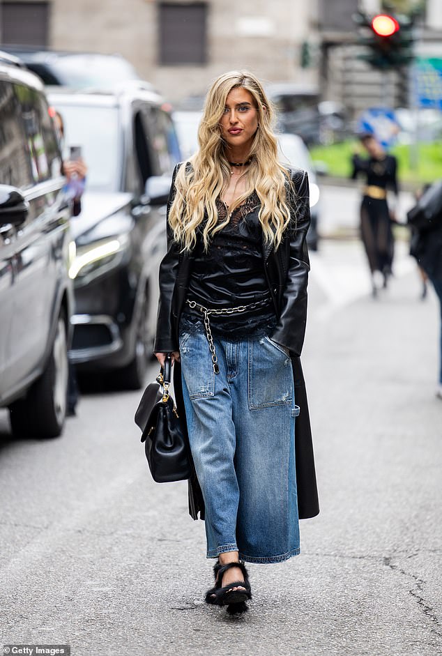 Emili Sindlev presented a relaxed look with a set of light blue denim jeans, a silk top, and a black leather overcoat.